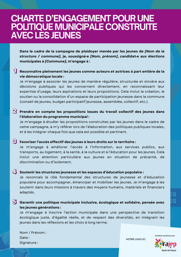 Une charte d’engagement destinée aux candidat·es, pour formaliser leur prise en compte des propositions jeunesse ;