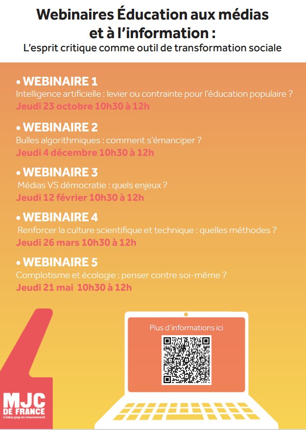 MJC de France organise un cycle de webinaires sur le thème « L’esprit critique comme outil de transformation sociale », à destination des professionnel·le·s de l’éducation populaire, des animateur·rice·s, des bénévoles, mais aussi de tous·tes celles et ceux qui souhaitent outiller leur réflexion sur les enjeux sociétaux contemporains.