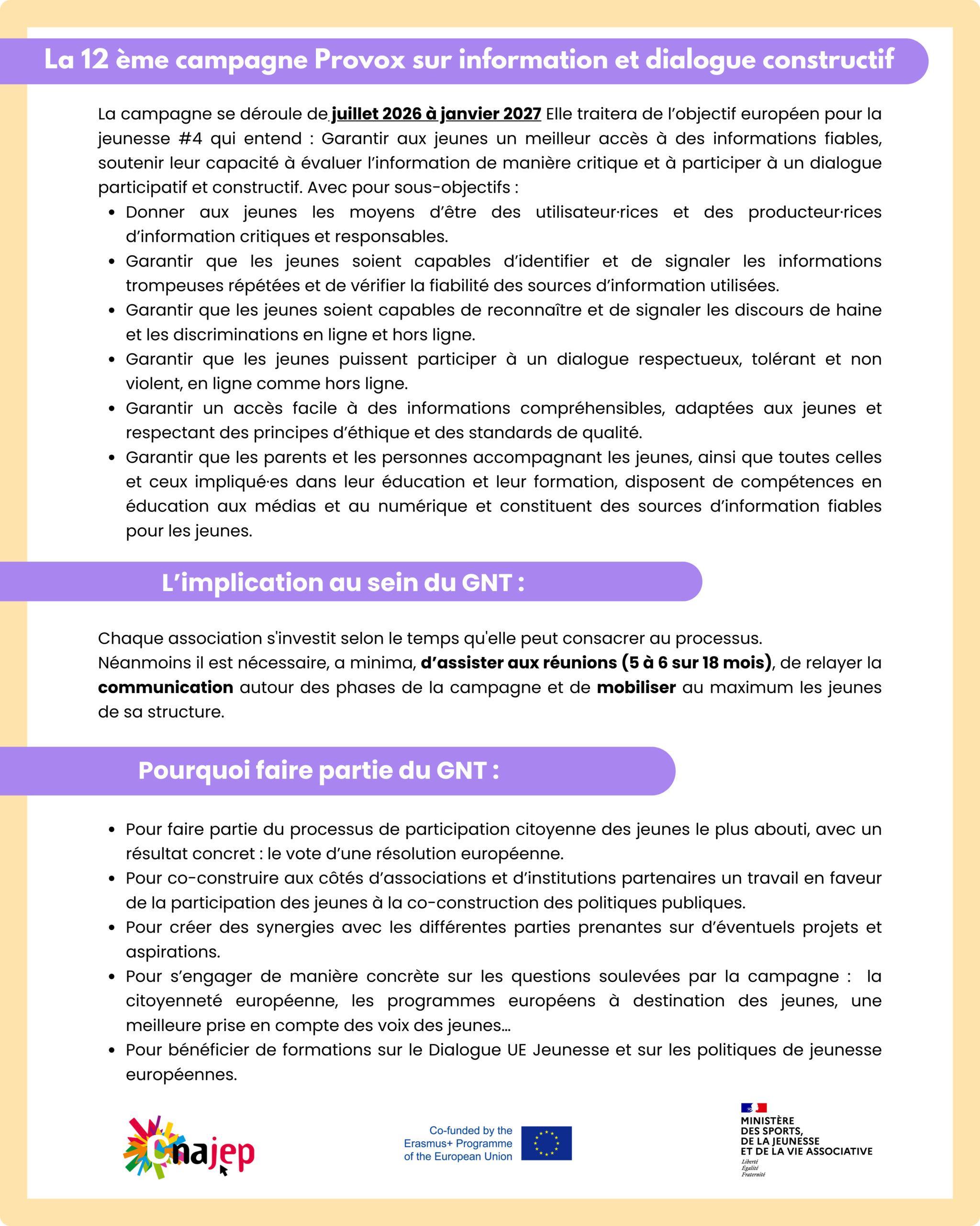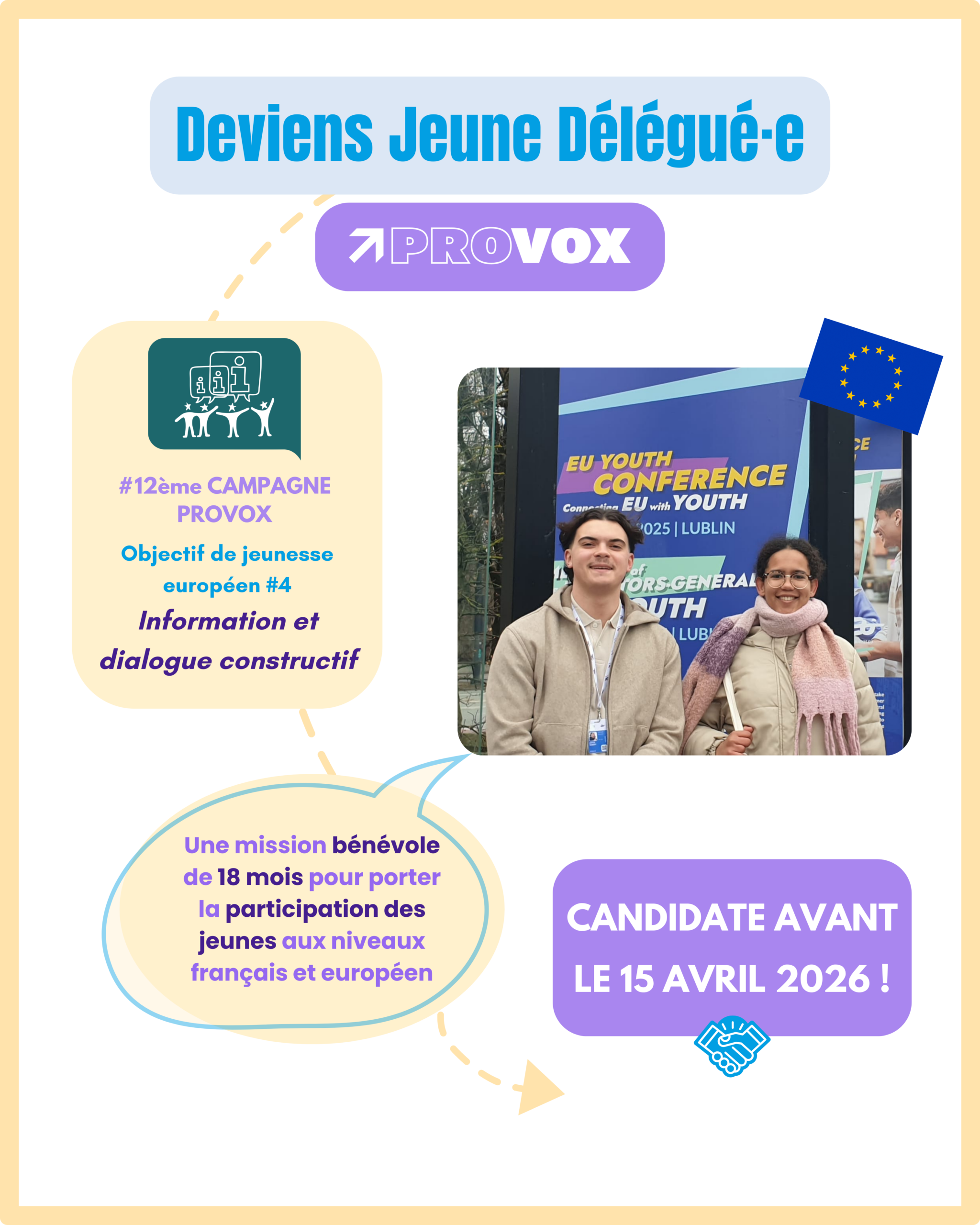 Cette nouvelle campagne s’inscrit dans le cadre du Dialogue UE Jeunesse et portera sur l’Objectif de jeunesse européen n°4 : Information et dialogue constructif.