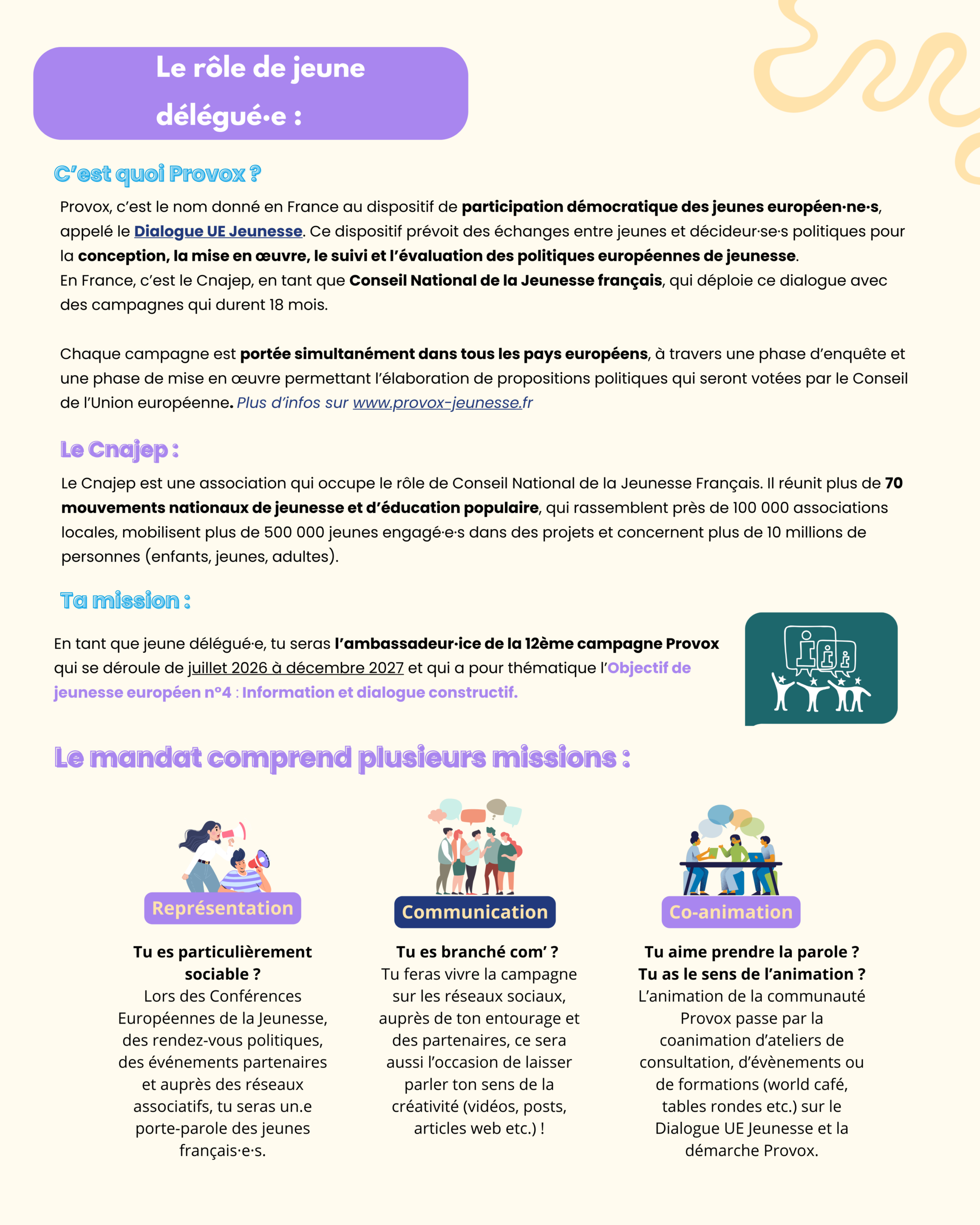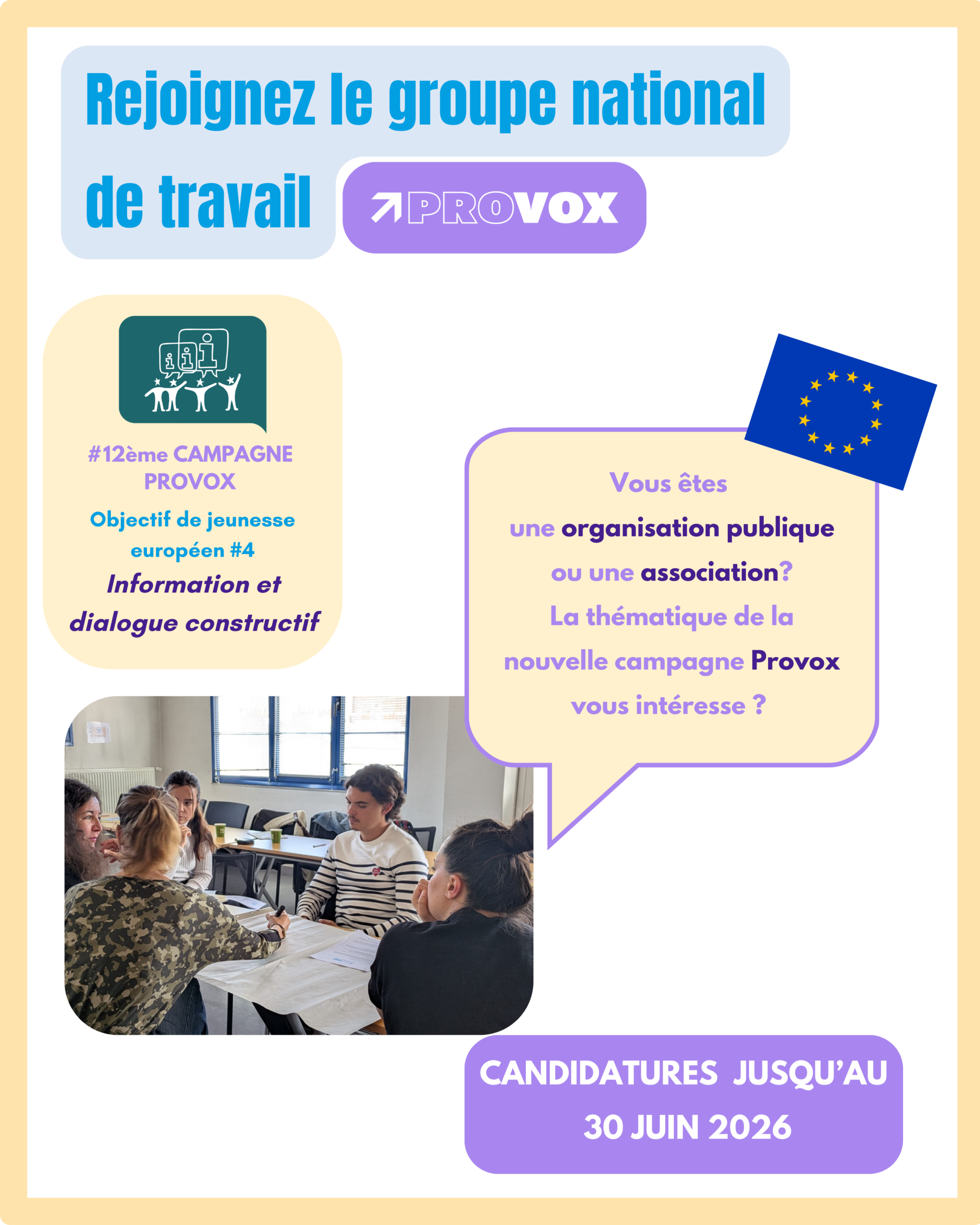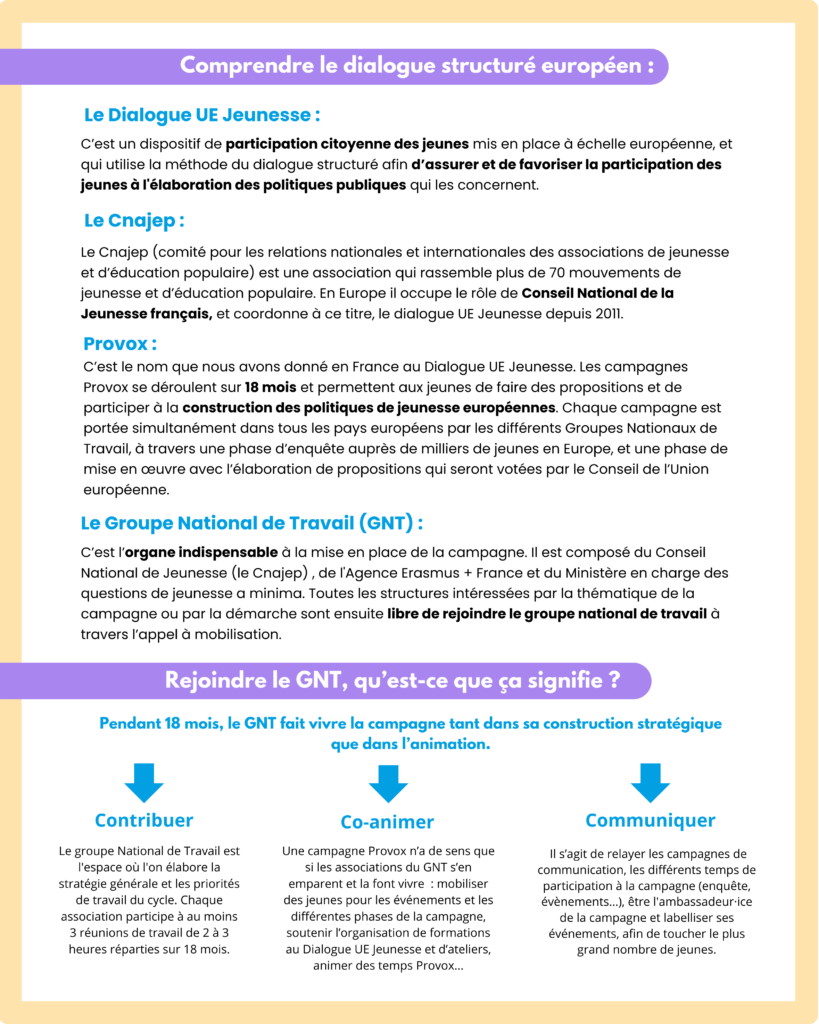Provox est le nom donné en France au Dialogue UE Jeunesse, un dispositif européen qui permet aux jeunes de participer à l’élaboration, au suivi et à l’évaluation des politiques publiques qui les concernent.