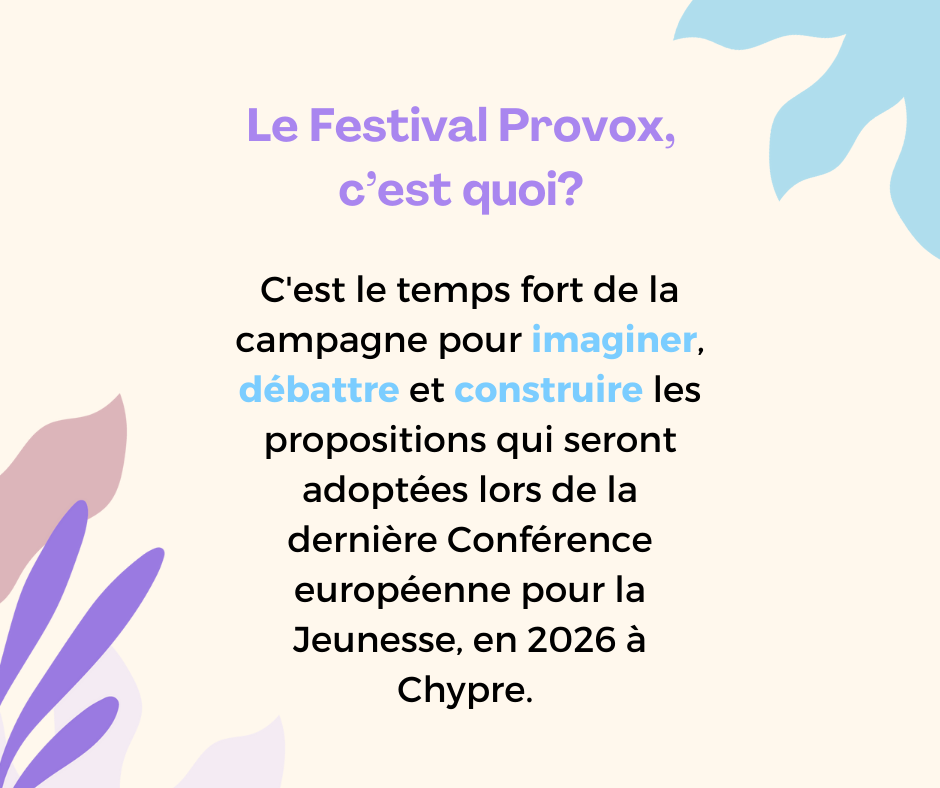 Le Festival Provox 2025 se tiendra du 12 au 14 décembre 2025 à la Résidence Internationale de Paris (44 rue Louis Lumière, 75020). Ce rendez-vous phare de la jeunesse réunit une centaine de jeunes de 13 à 30 ans, ainsi que des représentant·e·s et décideur·euse·s à tous les niveaux (local, national, européen).