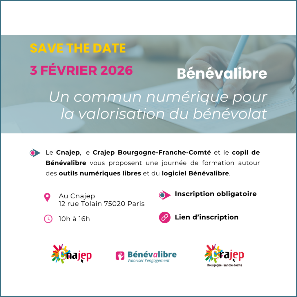 Le Cnajep, le Crajep Bourgogne-Franche-Comté et le copil de Bénévalibre vous proposent une journée de formation autour des outils numériques libres et du logiciel Bénévalibre, mardi 3 février 2026.