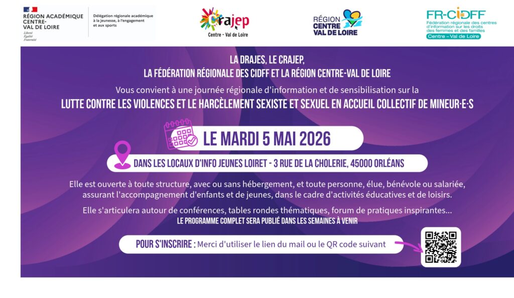 Coordonnée par le CRAJEP Centre-Val de Loire avec la DRAJES Centre-Val de Loire et plusieurs partenaires institutionnels et associatifs engagés sur ces enjeux, une journée régionale dédiée à la lutte contre les violences et le harcèlement sexistes et sexuels (VHSS) dans les accueils collectifs de mineurs (ACM) se tiendra le 5 mai 2026 à Orléans, dans les locaux d’Info Jeunes Loiret.